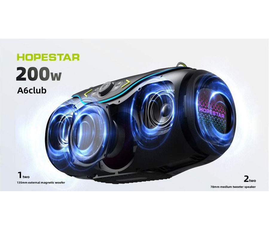 اسپیکر قابل حمل هوپ استار مدل A6 Club یکی از مدلهای قدرتمند و خوشساخت این برند محسوب میشه که برای مهمانیها، فضای باز و استفادههای حرفهای طراحی شده. بیا مشخصاتش رو با هم مرور کنیم: