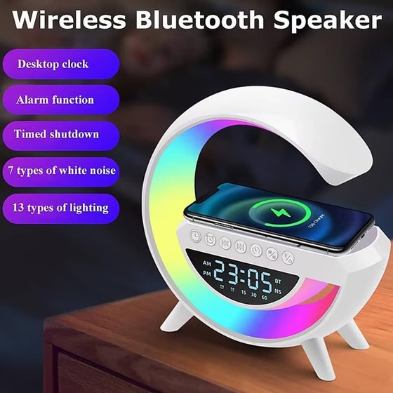 اندازه 23*8*23 سانتی متر درگاههای ارتباطی USB شارژر وایرلس قدرت 5 وات قدرت شارژر وایرلس 15 وات کابل همراه USB Type-C نوع چراغ LED هفت رنگ با طرح های مختلف ورودی فلش، کارت حافظه ، aux و بلوتوث وزن 799 گرم ولتاژ خروجی 5.0 ولت ولتاژ ورودی 5